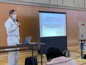 防災士会員30数名が参加し、「感染症に対応した避難所開設のポイント、複合災害の発生をいかに防ぐか」について、受講、避難所受付の実技訓練を実施しました。